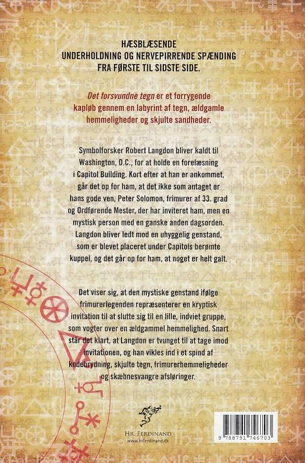 Dan Brown, Det forsvundne tegn er 3. selvstændig bog om symbolforskeren Robert Langdon. Bogen er brugt og den er i fin stand.