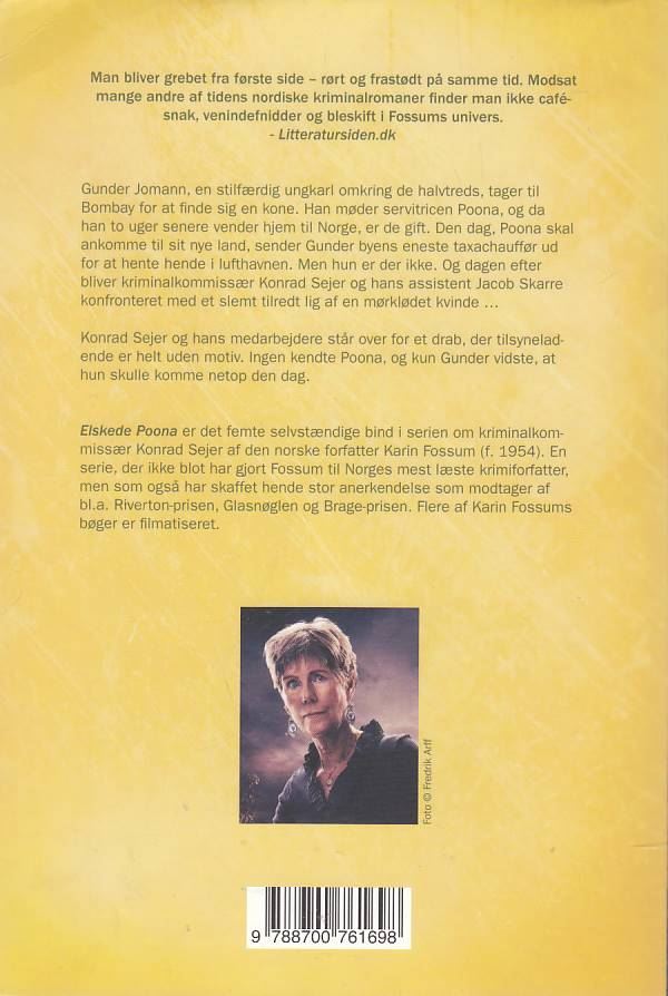 Karin Fossum, Elskede Poona er 5. bind i krimiserien om kriminalkommissær Konrad Sejer. Bøgerne kan læses uafhængig af hinanden. Bogen er brugt og i god stand.