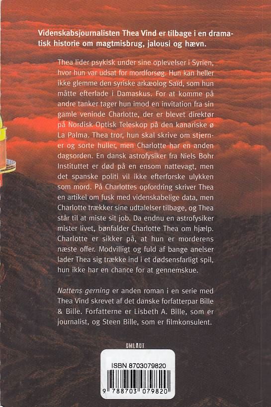 Nattens gerninger er 2. roman i serien om videnskabsjournalisten Thea Vind. Bogen er brugt og i fin stand.