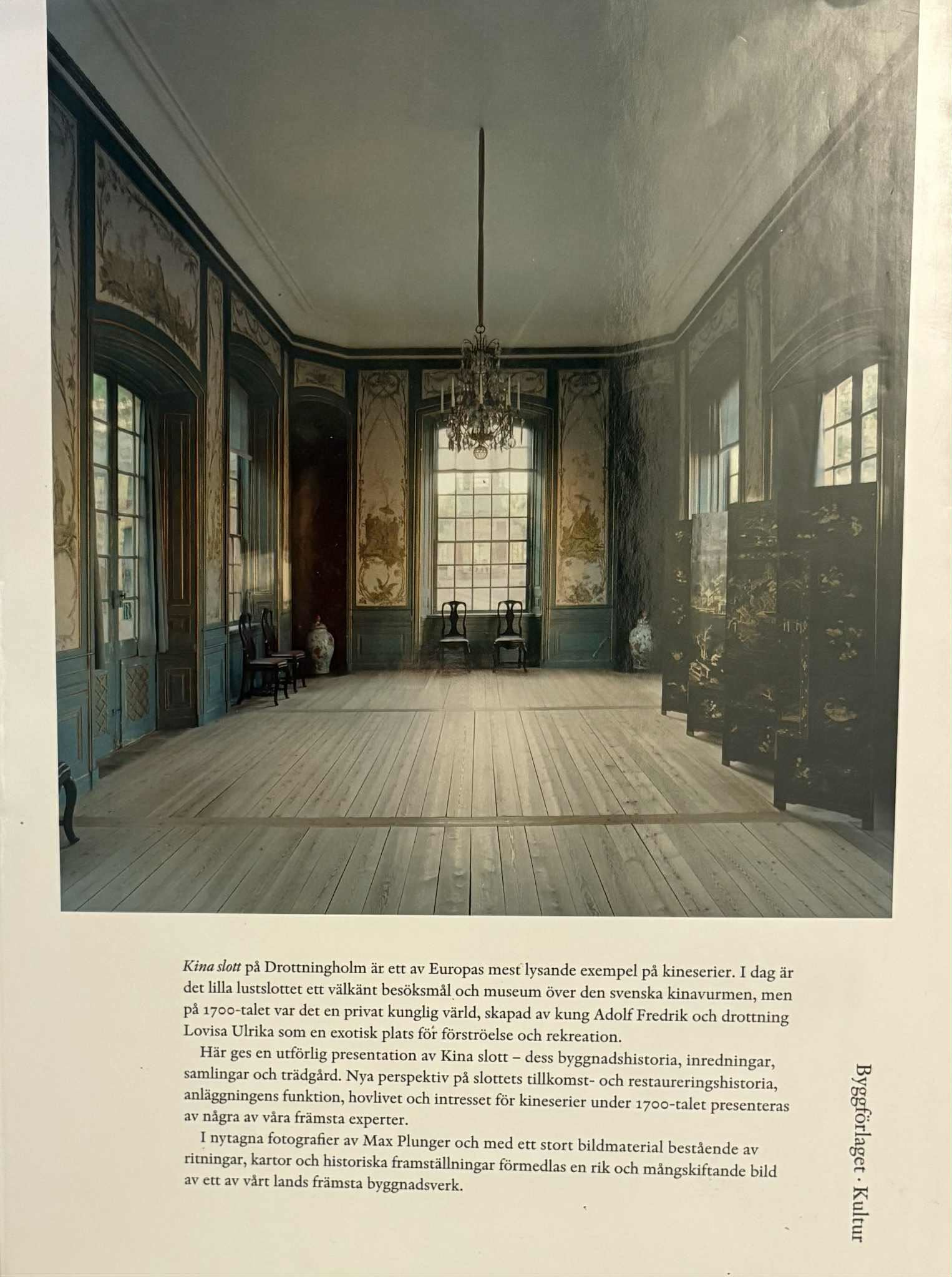 En detaljeret præsentation af det kinesiske lystslot, dets byggehistorie, interiør og have. China Palace på Drottningholm er et af de førende eksempler på bygninger i siniciserende stil i Europa. Nye aspekter af etablissementets og hoflivets historie i Kina gives i dette bind, illustreret med nyligt optagne fotografier af Max Plunger